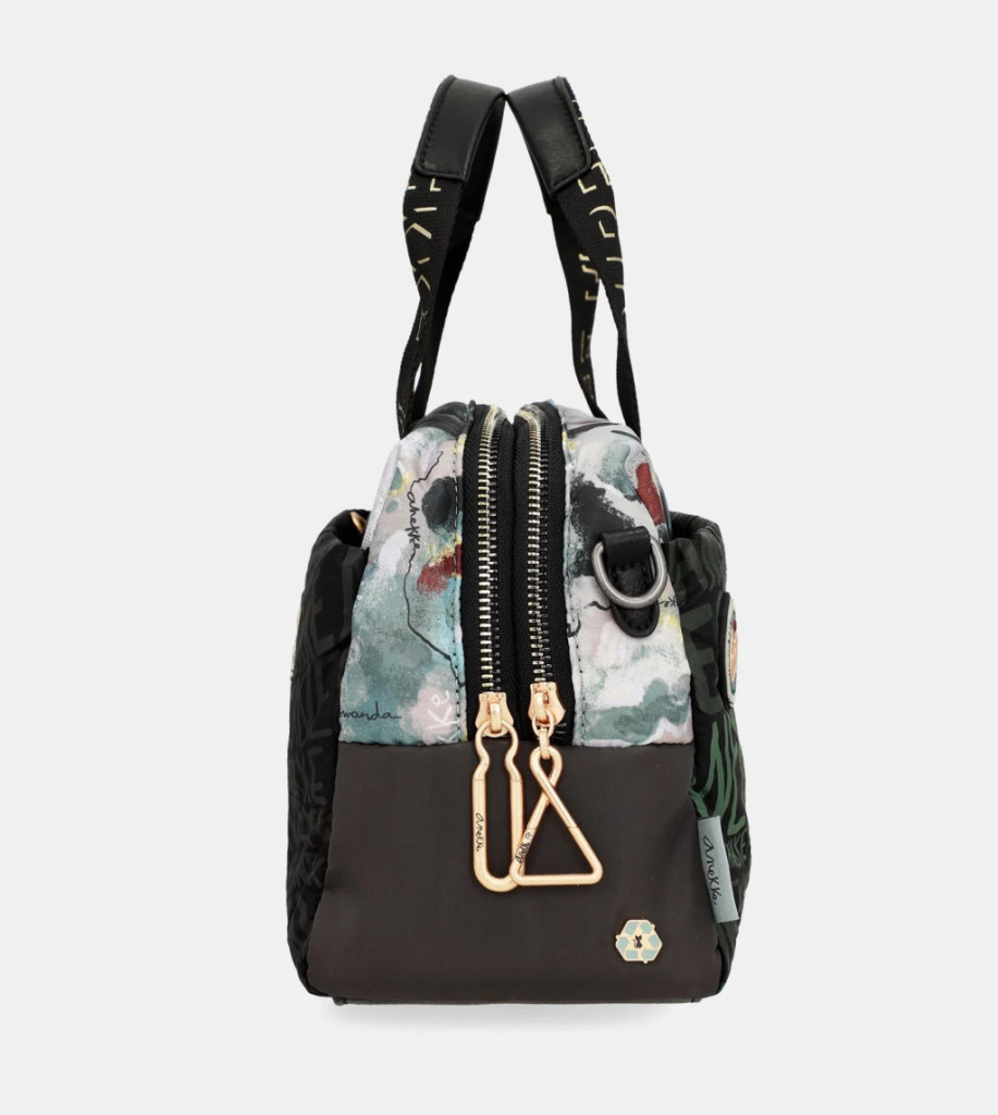 Két fogantyúja és egy levehető állítható vállpántja van. A belső rész eredeti, a kollekcióból származó motívumokkal nyomott anyaggal bélelt, zsebekkel.