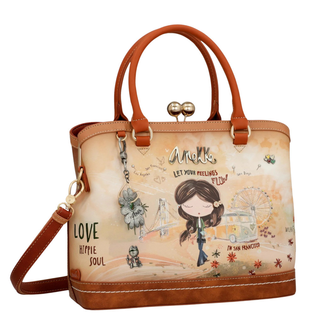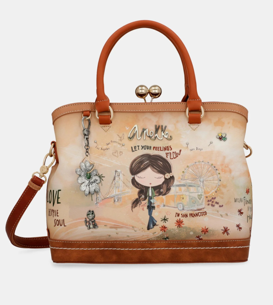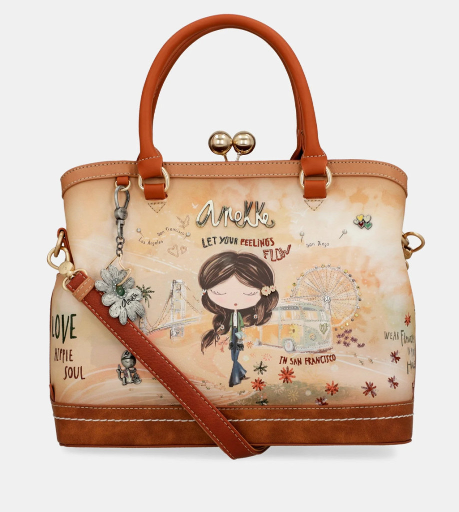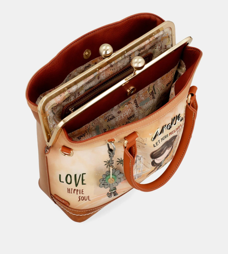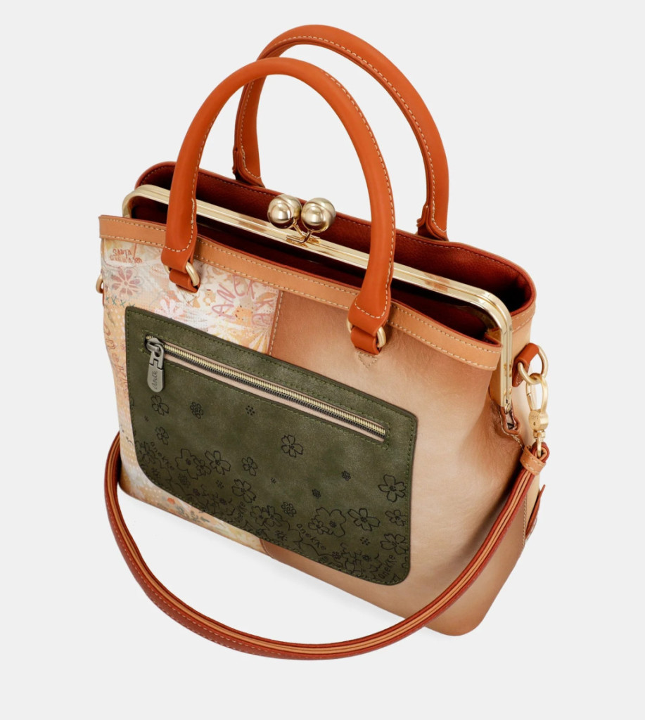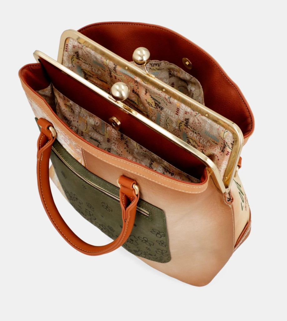 Ez a vállpánttal vállon is hordható kézitáska 3 különálló rekesszel rendelkezik, közepes-nagy méretű és hátsó zsebbel rendelkezik. A középső rekeszben eredeti csókkapcsos zár található, amely egy vintage vonást ad, amelyet imádni fog. A rekesz mindkét oldalán mágneses gombbal záródik. Két fogantyúval és levehető állítható vállpánttal rendelkezik. Belseje bélelt, zsebekkel.