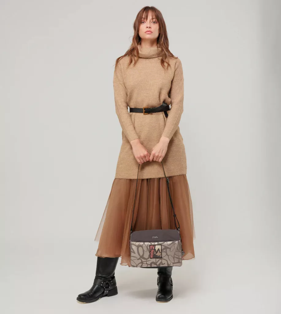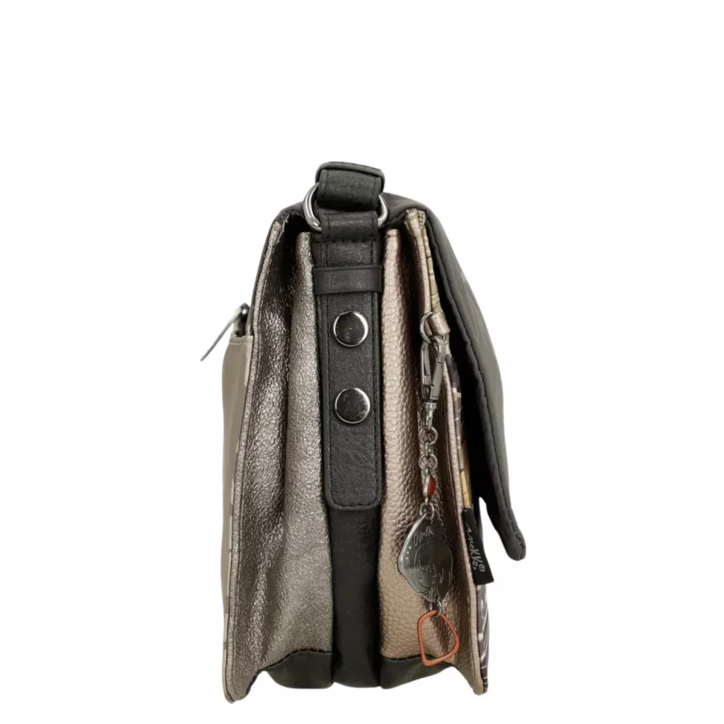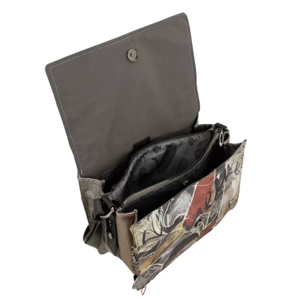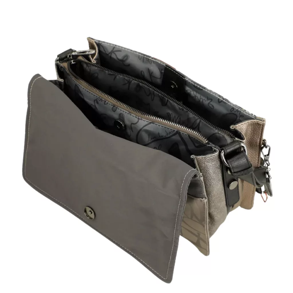 Ez a fedeles táska három különálló rekesszel rendelkezik. Mérete közepes-nagy, és egy hátsó zsebbel is rendelkezik. A táskához vállpánt, belső bélés és zsebek is tartoznak.