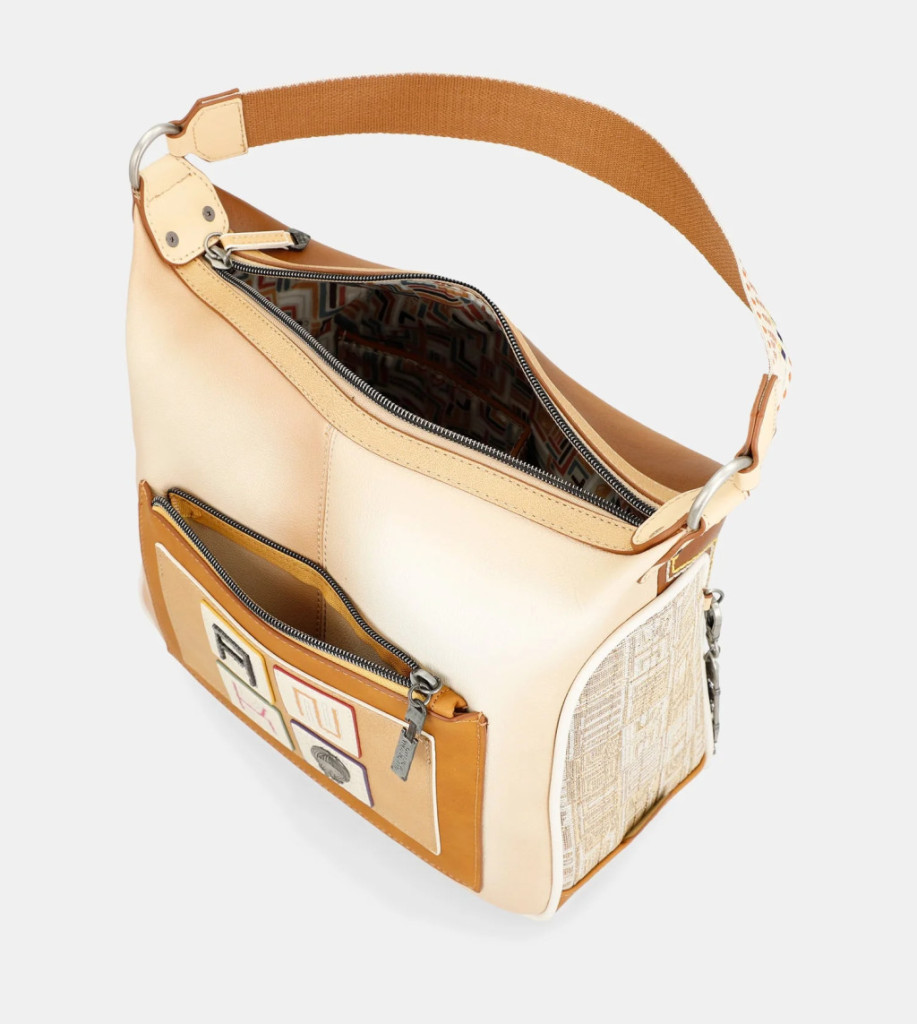 A táskának egy vállpántja van. A vállpánt különleges kialakítású, nagyon eredeti színekkel. A belső rész eredeti, a kollekció motívumaival nyomtatott anyaggal bélelt, és zsebekkel is rendelkezik.