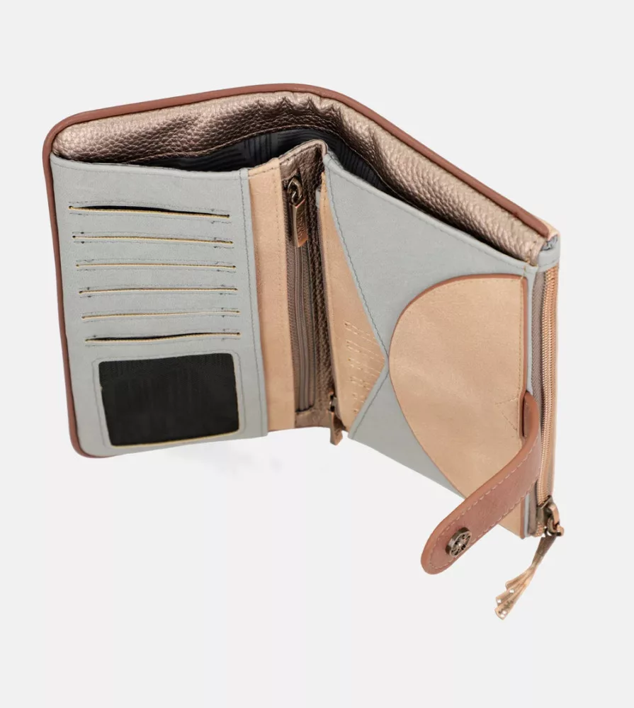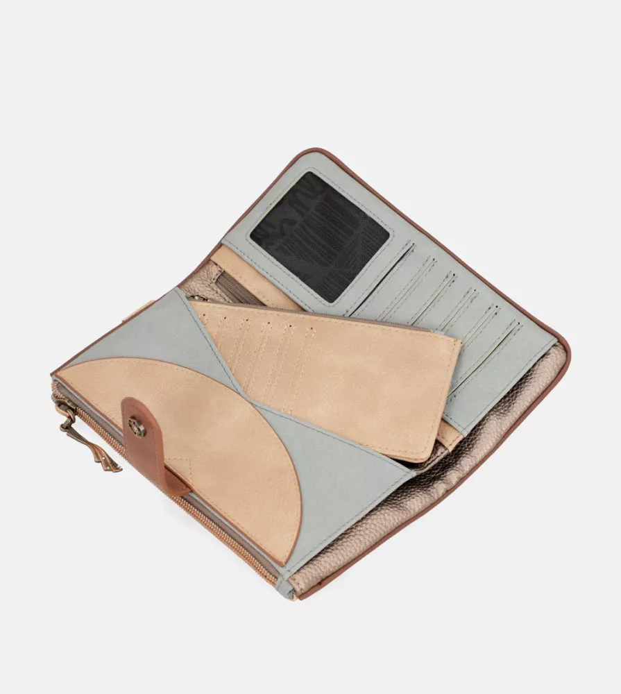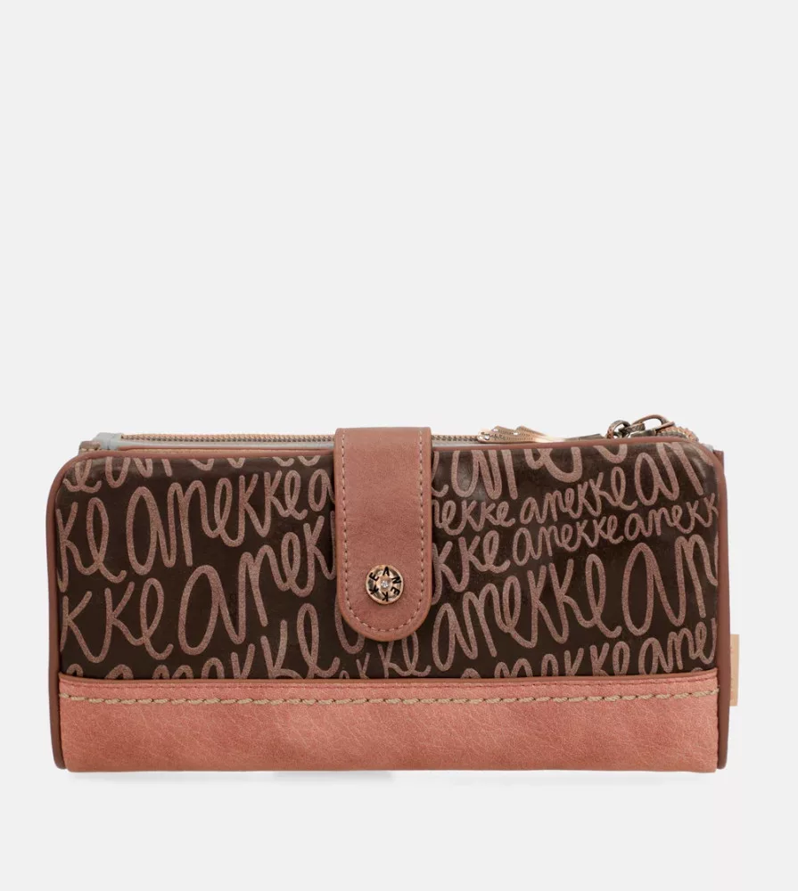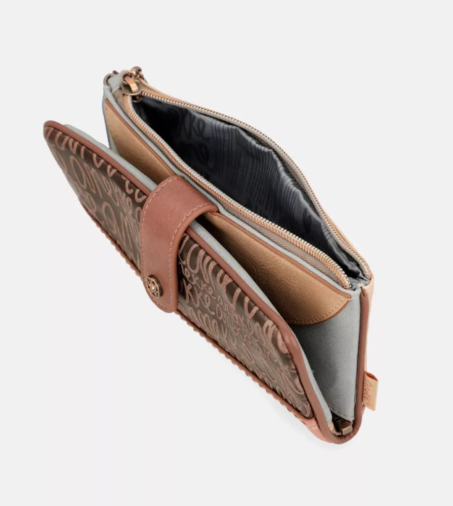 Ez a nagyméretű pénztárca rugalmas anyagból készült. Két fő rekesze van: hátul, ahol egy nagy pénztárcát és helyet találsz a számláknak és/vagy a kártyáknak. Felül cipzáros, belül pedig érméket tárolhatsz. Az egész belső tér bélelt. Ezen kívül van benne egy kivehető kártyatartó is.