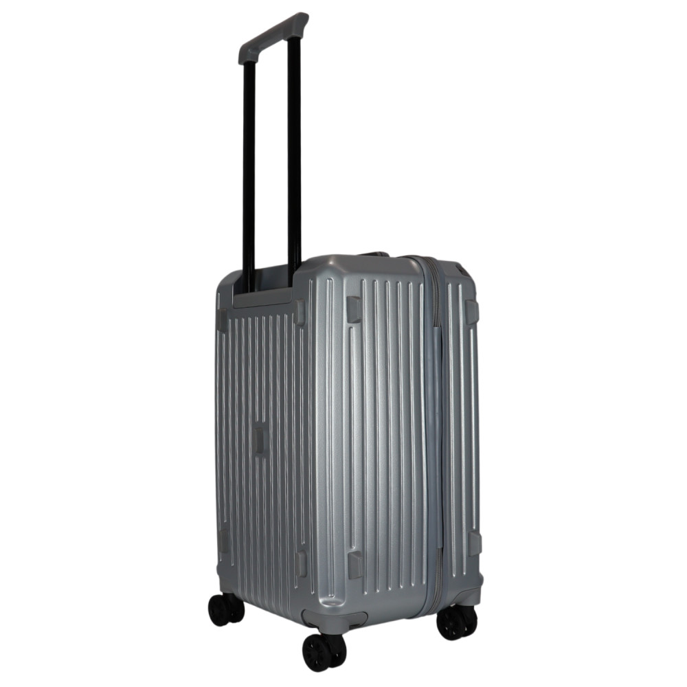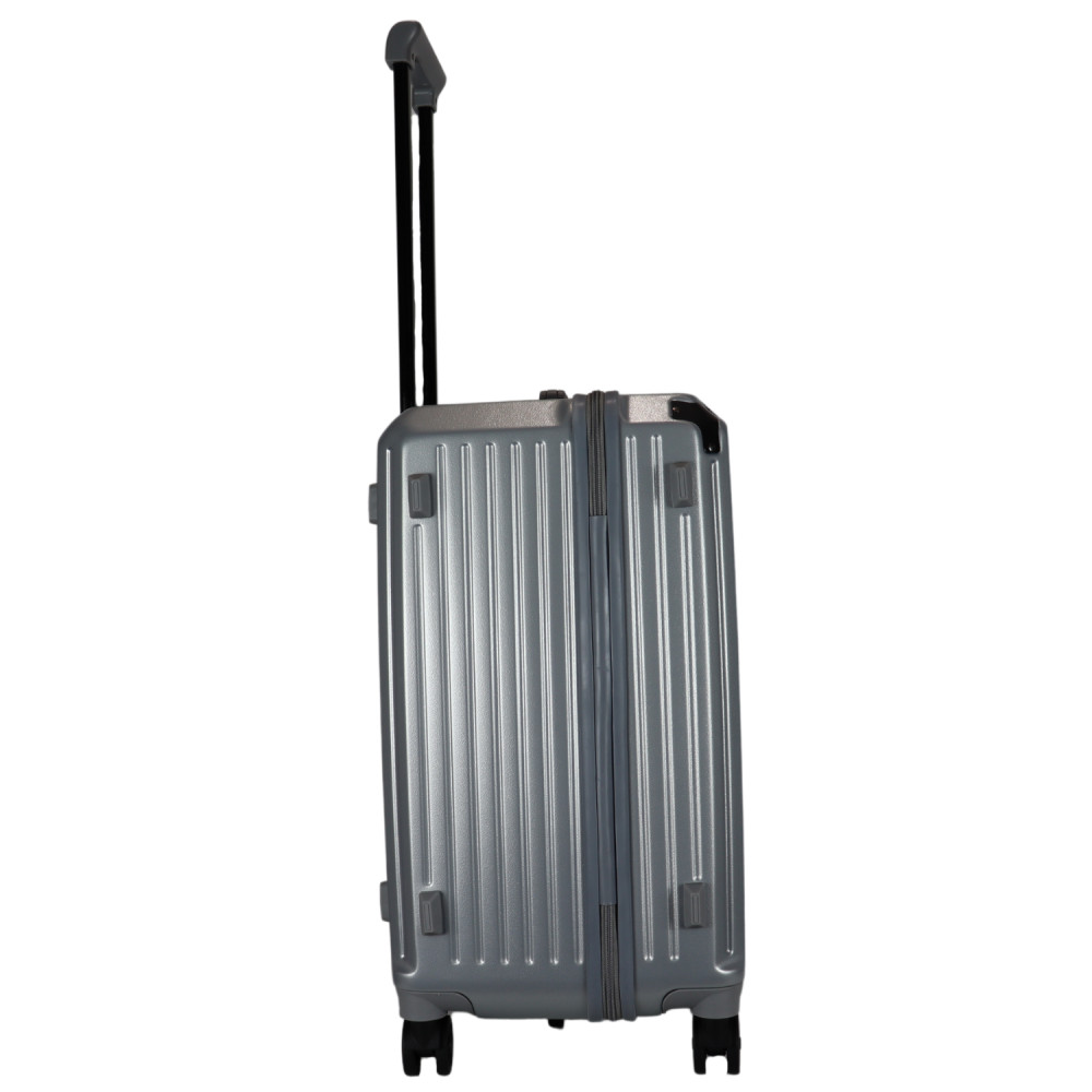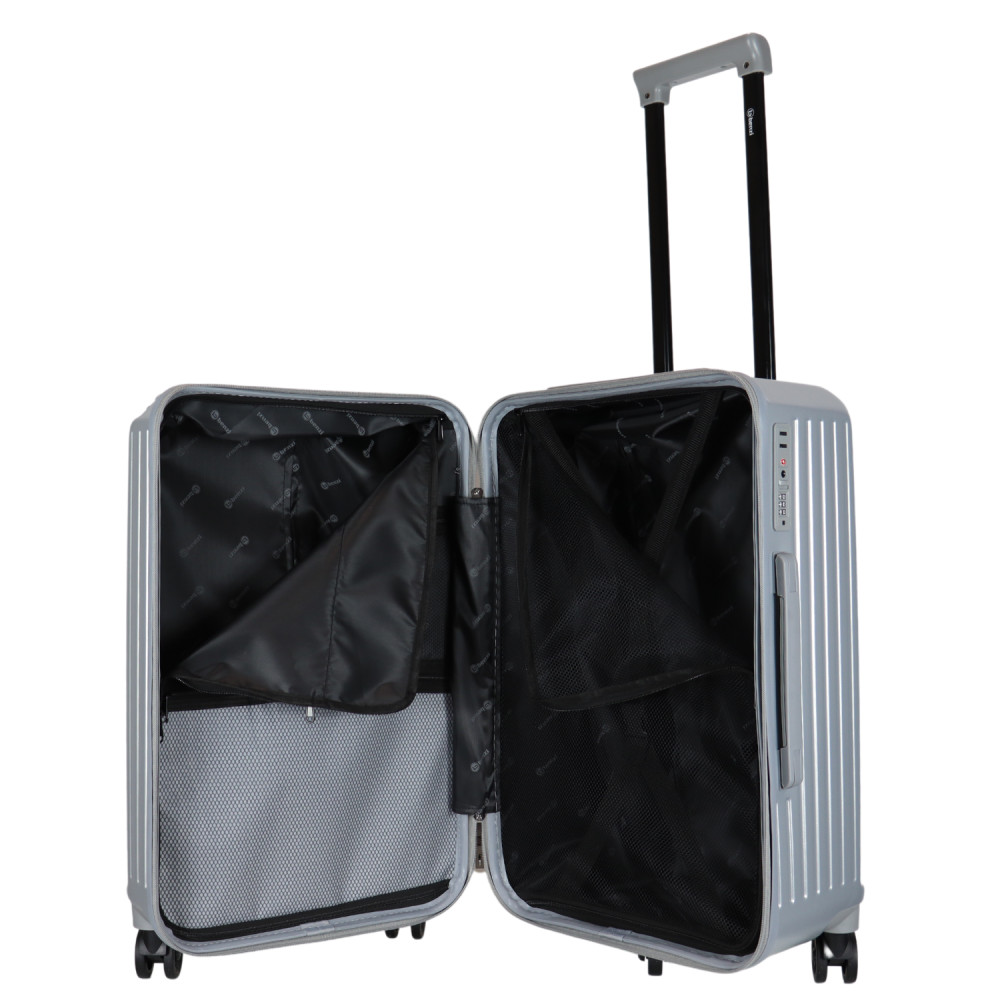 Benzi prémium Spanyol közepes méretű bőrönd. Fiatalos és stílusos, "a tökéletes városi társ". 1-2 hetes utazáshoz ajánljuk. Anyaga kemény, ütésálló ABS. Strapabíró, 360 fokban finoman gördülő dupla kerekes négykerekű. Tetején és oldalán fix kézbefogó fogantyú. Tetején kihúzható húzokar. Másik oldalán négy strapabíró védőtalp. Körbe cipzáras záródású. Az oldalán 3-jegyű TSA számzár, a fő cipzárok lezárásához. A számzár egyénileg, tetszés szerint egyszerűen programozható. Belül teljesen bélelet poliészter. Belseje két rekeszes, cipzáras elválasztóval és állítható ruha rögzítő kereszt pántokkal. Külső méretek (szélesség x magasság x mélység) 39 x 63 x 33 cm (magába foglalva a kerekeket, fogantyúkat). Súlya 3,3 kg. Térfogata 72 l.