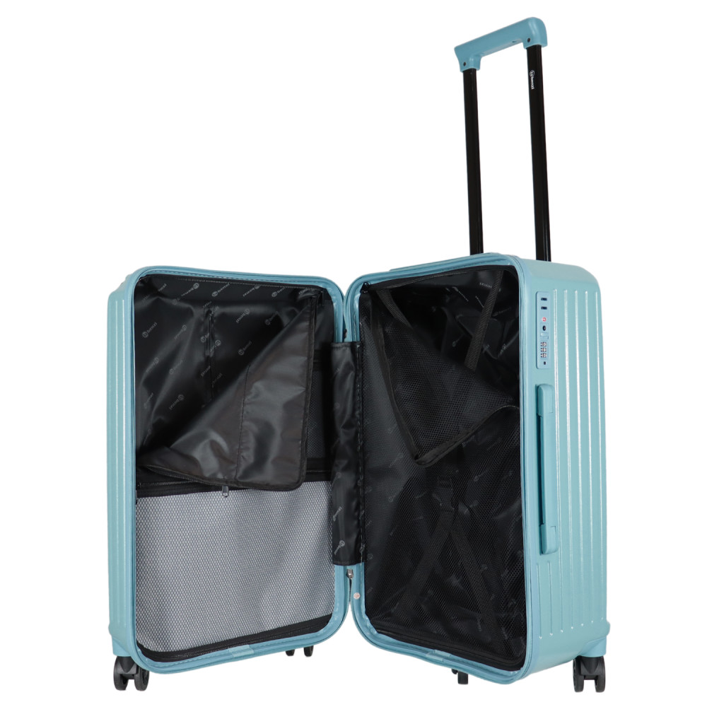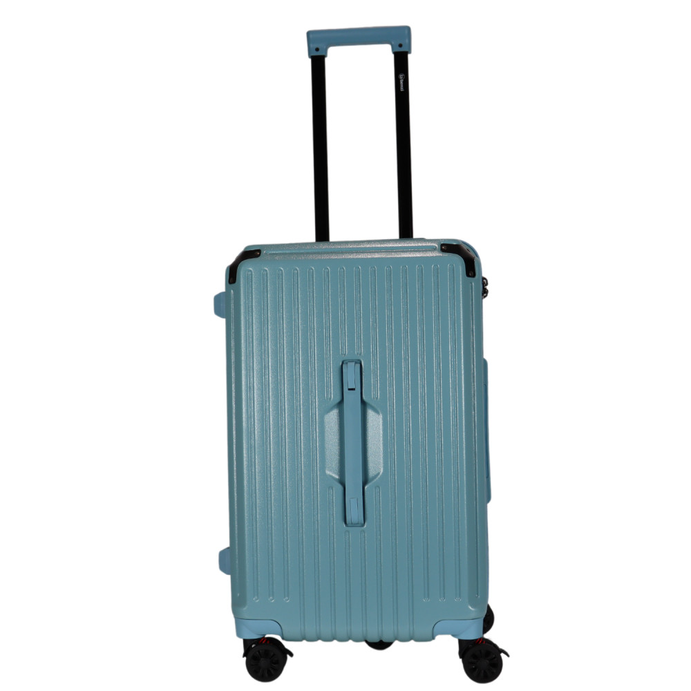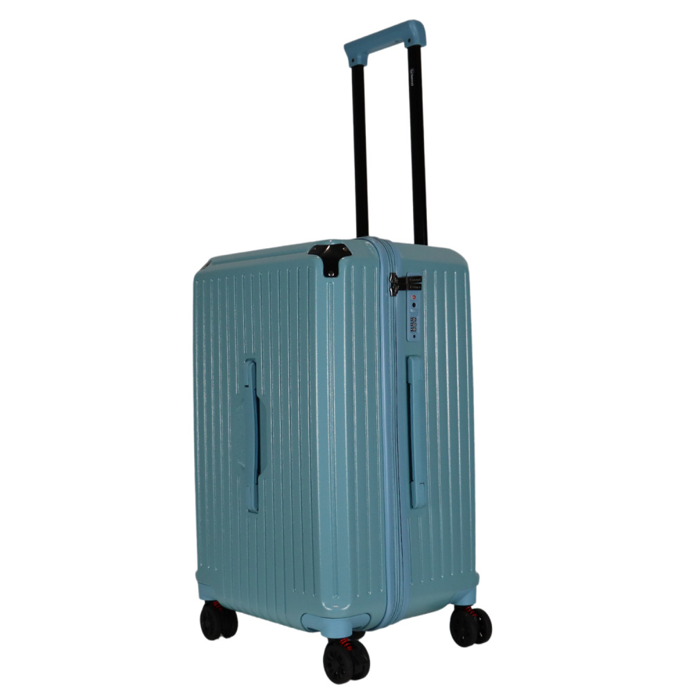 Benzi prémium Spanyol közepes méretű bőrönd. Fiatalos és stílusos, "a tökéletes városi társ". 1-2 hetes utazáshoz ajánljuk. Anyaga kemény, ütésálló ABS. Strapabíró, 360 fokban finoman gördülő dupla kerekes négykerekű. Tetején és oldalán fix kézbefogó fogantyú. Tetején kihúzható húzokar. Másik oldalán négy strapabíró védőtalp. Körbe cipzáras záródású. Az oldalán 3-jegyű TSA számzár, a fő cipzárok lezárásához. A számzár egyénileg, tetszés szerint egyszerűen programozható. Belül teljesen bélelet poliészter. Belseje két rekeszes, cipzáras elválasztóval és állítható ruha rögzítő kereszt pántokkal. Külső méretek (szélesség x magasság x mélység) 39 x 63 x 33 cm (magába foglalva a kerekeket, fogantyúkat). Súlya 3,3 kg. Térfogata 72 l.