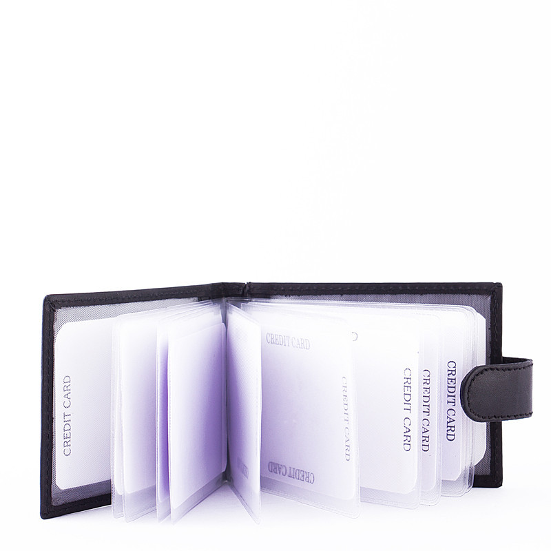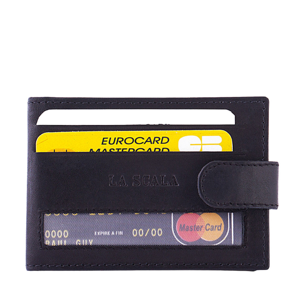 Marha bőrből készült kártyatartó, külső patentos átkapcsolóval, La Scala felirattal. Belül kártyatartókkal.