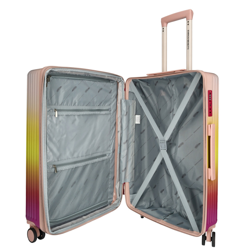 Enrico Benetti Havana közepes méretű bőrönd. Modern dizájnjával és robusztus anyagaival ez a bőrönd kortárs megjelenést kölcsönöz. 1-2 hetes utazáshoz ajánljuk. Anyaga karcálló, robusztus ABS. Strapabíró dupla kerekes, finoman gördülő négykerekű. Tetején és oldalán fix kézbefogó fogantyú. Tetején két szekcióban kihúzható, masszív húzokarral. Körbe cipzáras záródású. Az oldalán 3-jegyű számzár, a fő cipzárak lezárásához. A számzár egyénileg, tetszés szerint egyszerűen programozható. Belül a bélelt poliészter tere lenyűgöz. Belseje két rekeszes, cipzáras elválasztókkal, cipzáras zsebbel és állítható ruha rögzítő kereszt pántokkal. Méretek (szélesség x magasság x mélység) 40 x 65 x 28 cm (magába foglalva a kerekeket, fogantyúkat). Súlya 3,6 kg. Térfogata 73 l.