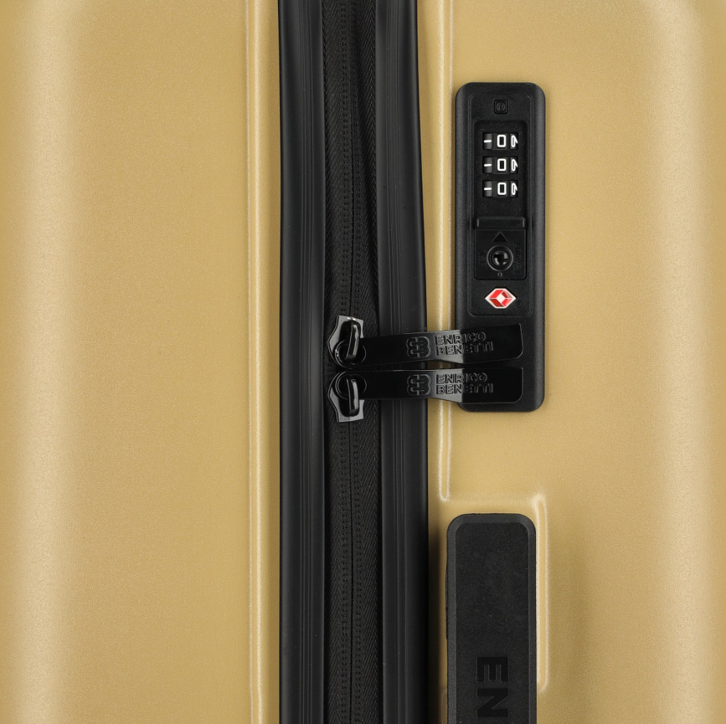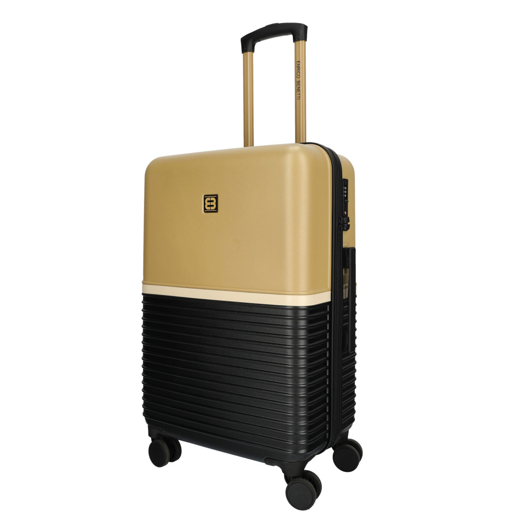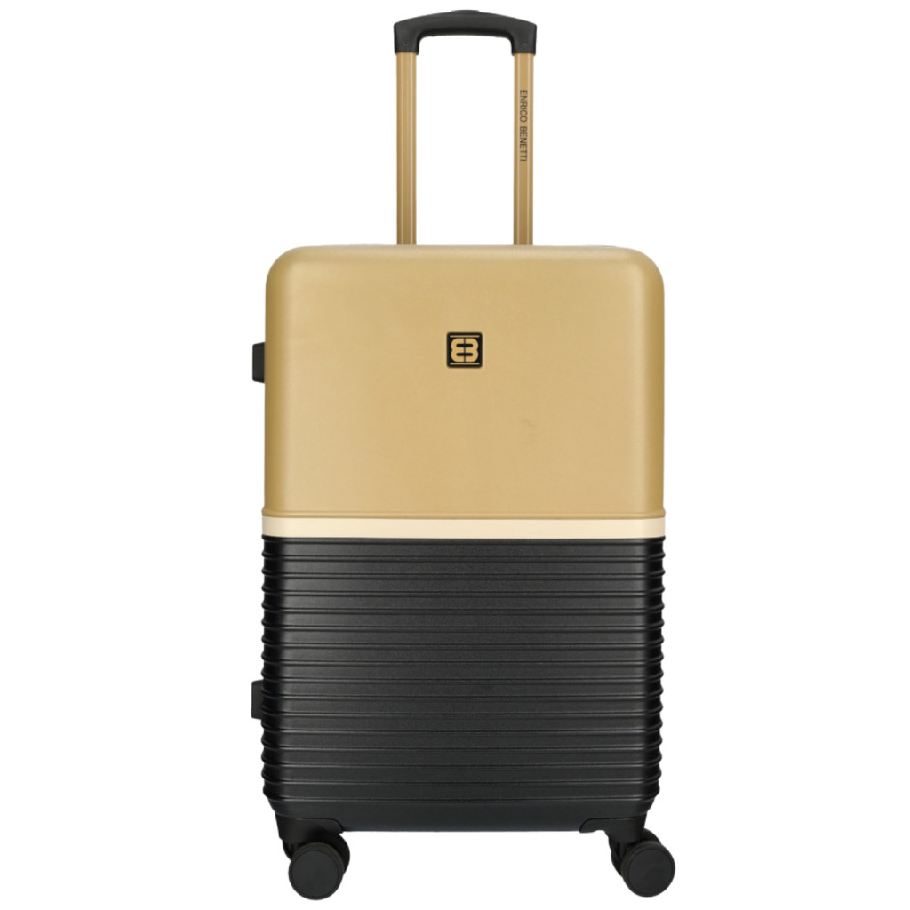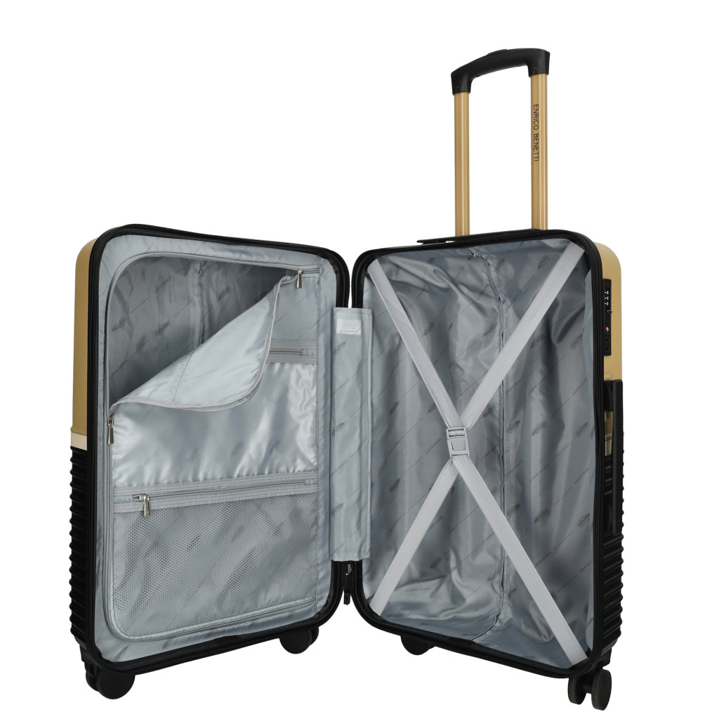 Enrico Benetti Princetown közepes méretű, elegáns bőrönd. 1-2 hetes utazáshoz ajánljuk. Anyaga karcálló, robusztus ABS. Strapabíró dupla kerekes, finoman gördülő négykerekű. Tetején és oldalán fix kézbefogó fogantyú. Tetején két szekcióban kihúzható, masszív húzokarral. Körbe cipzáras záródású. Az oldalán 3-jegyű számzár, a fő cipzárak lezárásához. A számzár egyénileg, tetszés szerint egyszerűen programozható. Belül a bélelt poliészter tere lenyűgöz. Belseje két rekeszes, cipzáras elválasztókkal, cipzáras zsebbel és állítható ruha rögzítő kereszt pántokkal. Méretek (szélesség x magasság x mélység) 45 x 65 x 26 cm (magába foglalva a kerekeket, fogantyúkat). Súlya 3,4 kg. Térfogata 76 l. Garancia 2 év.