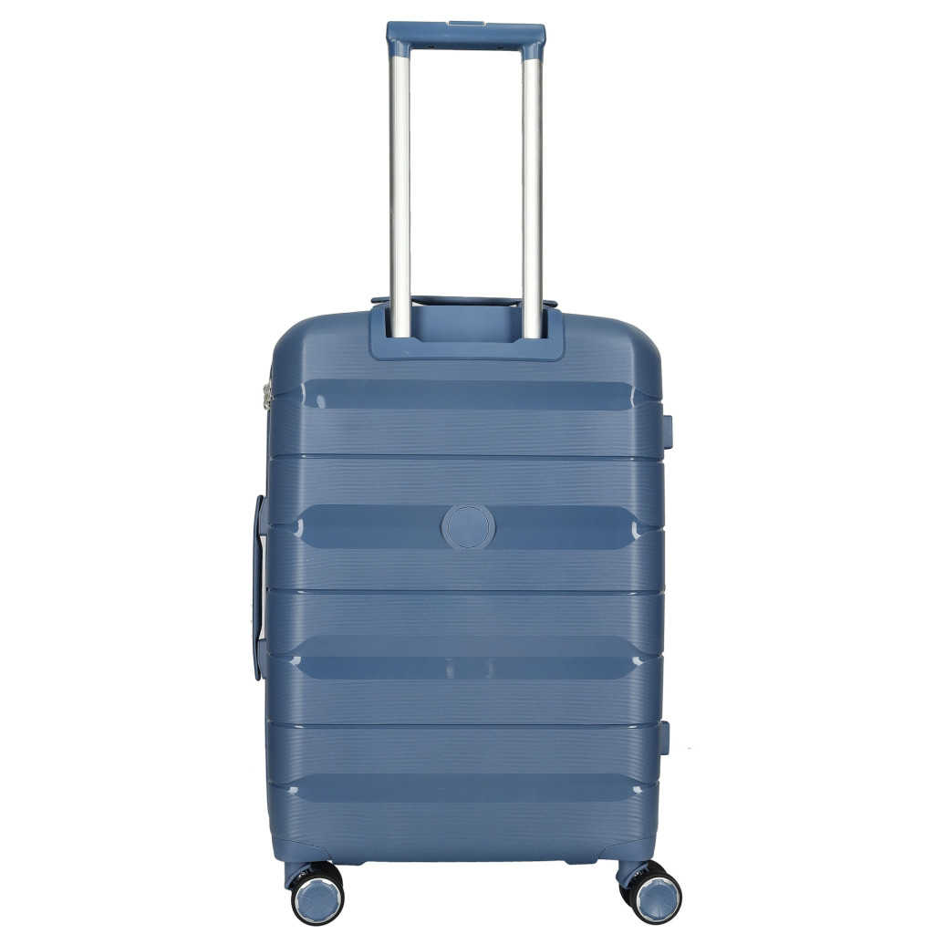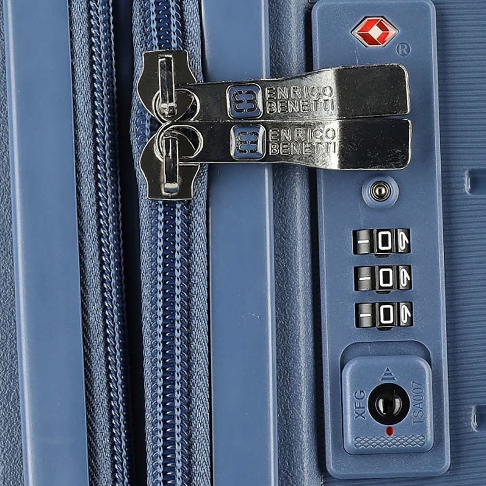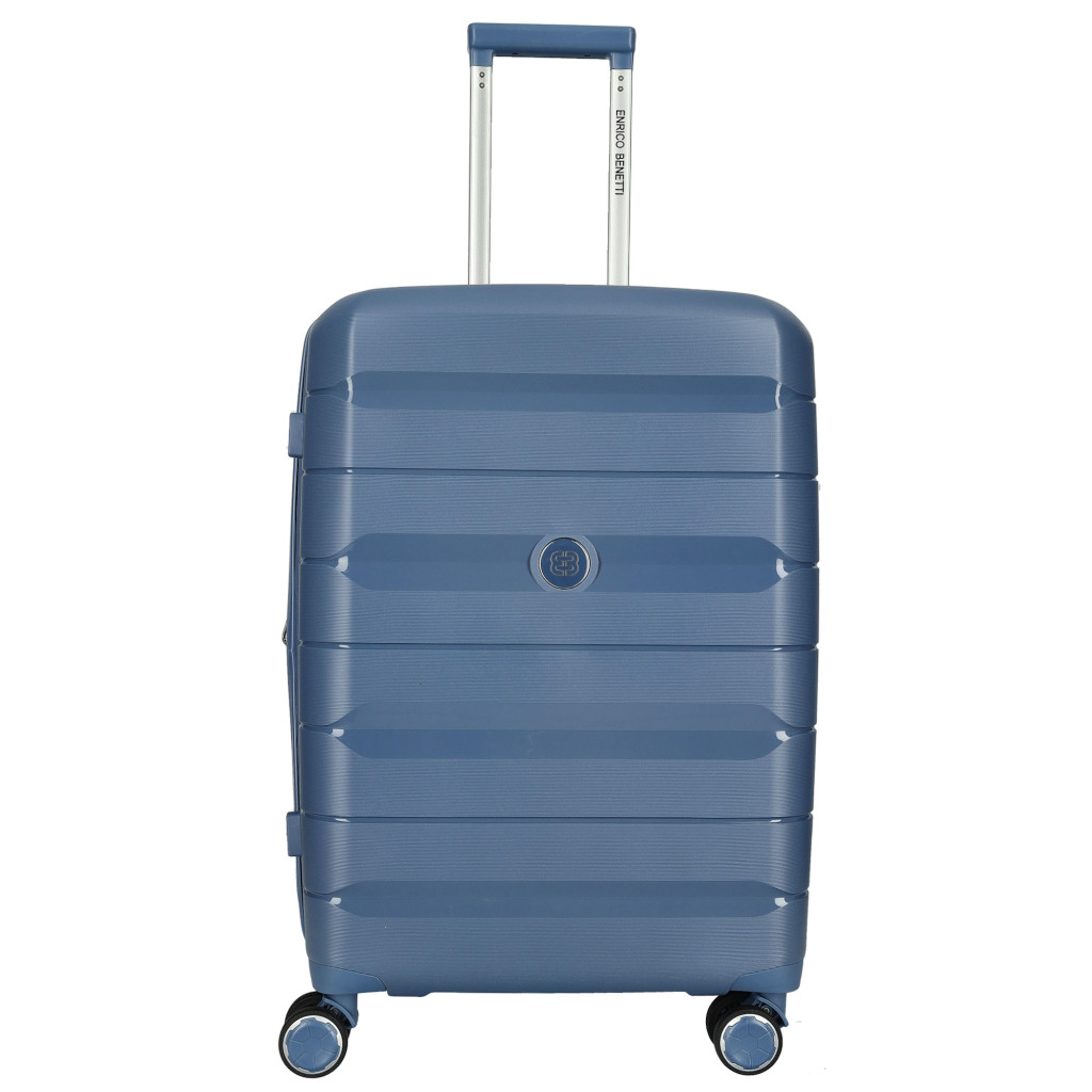 Enrico Benetti Montreal közepes méretű bőrönd. Könnyű és stílusos Montreal sorozat. 1-2 hetes utazáshoz ajánljuk. Anyaga kemény, ütésálló Polipropilén. Strapabíró dupla kerekes, finoman gördülő négykerekű. Tetején és oldalán fix kézbefogó fogantyú. Tetején két szekcióban kihúzható, masszív húzokarral. Körbe cipzáras záródású. Az oldalán 3-jegyű TSA számzár, a fő cipzárak lezárásához. A számzár egyénileg, tetszés szerint egyszerűen programozható. Belül teljesen bélelet poliészter tere lenyűgöz. Belseje két rekeszes, cipzáras elválasztókkal, cipzáras zsebbel és állítható ruha rögzítő kereszt pántokkal. Méretek (szélesség x magasság x mélység) 44 x 65 x 26 cm (magába foglalva a kerekeket, fogantyúkat). Súlya 3,7 kg. Térfogata 64 l.