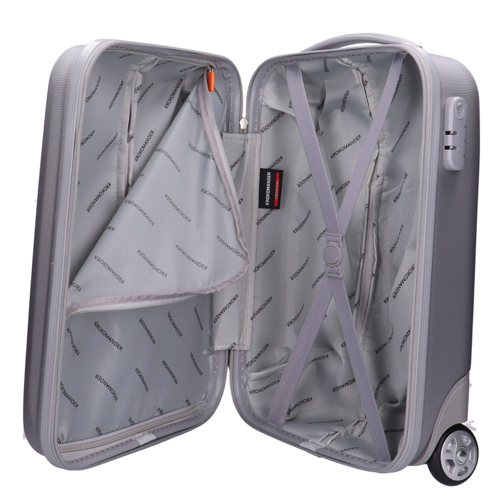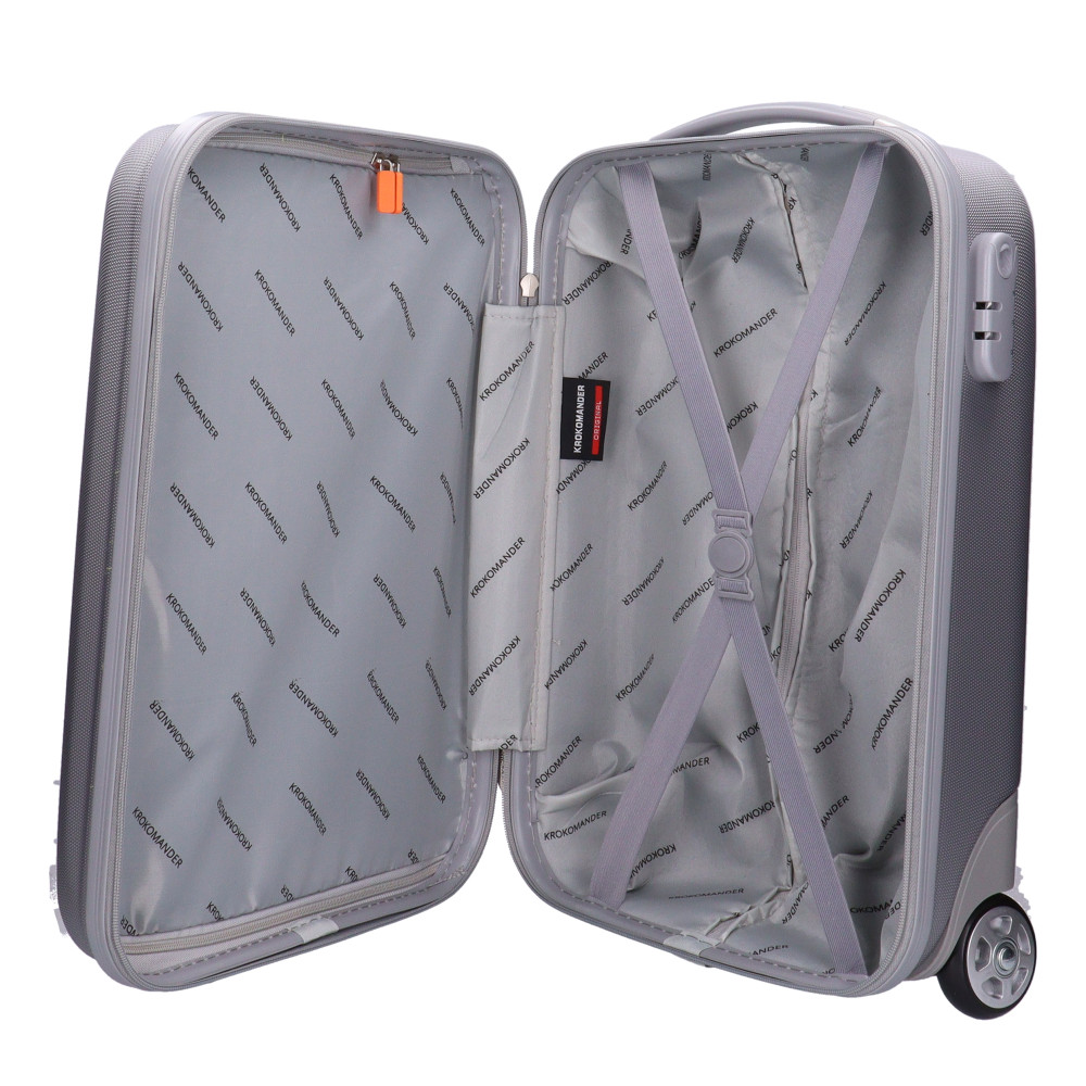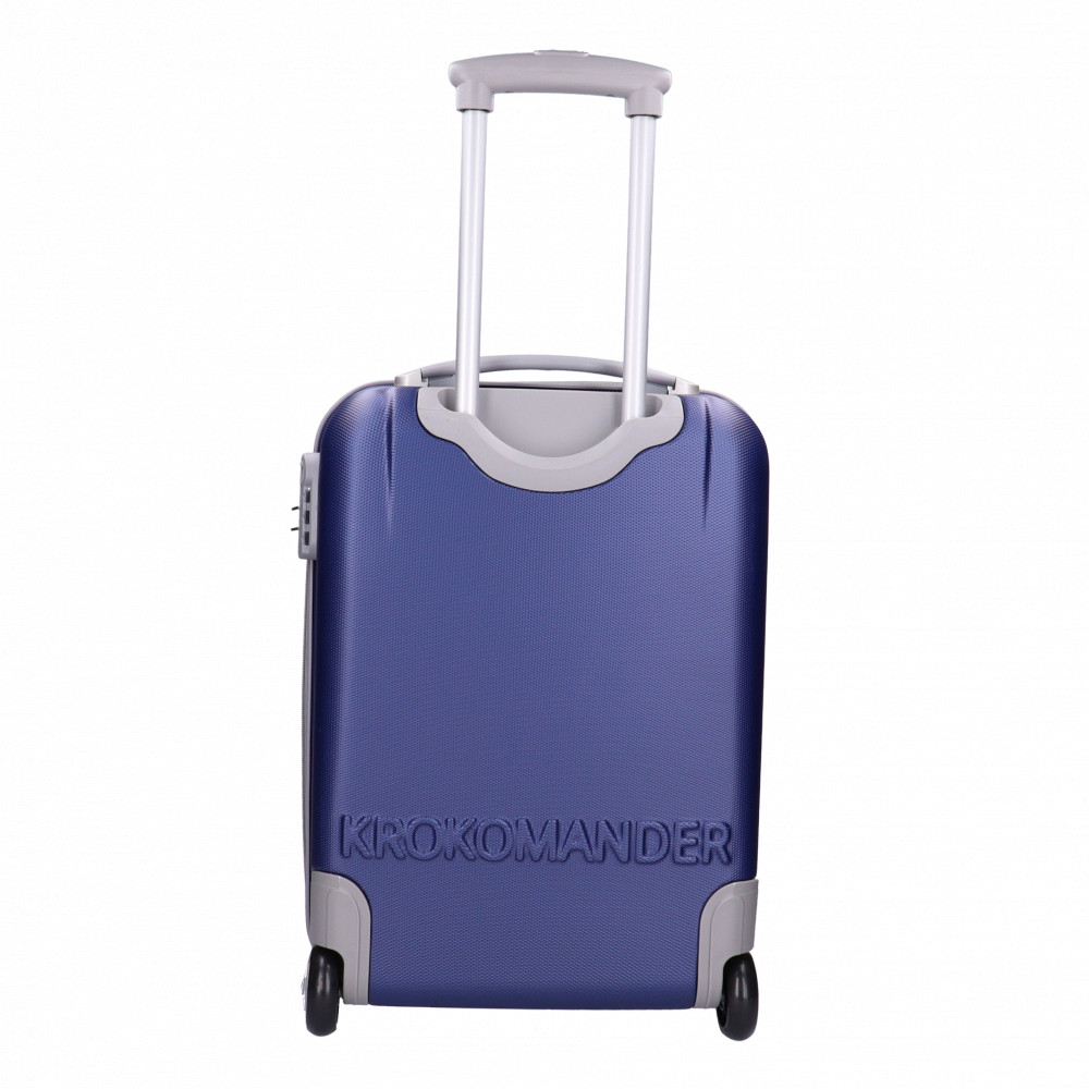 Krokomander kabin méretű bőrönd. Repülőre felvihető kézipoggyász méret, pár napos utazáshoz tökéletes. Strapabíró, finoman gördülő kétkerekű. Anyaga robosztus, karcálló, erős ABS. Tetején egy fix kézbefogó fogantyú és egy két szekcióban kihúzható húzókar. Körbe cipzáras záródású, az oldalán 3-jegyű számzárral. A számzár tetszés szerint egyszerűen programozható. Belseje teljesen bélelt, egy cipzáras rekesszel és állítható belső ruha rögzítő keresztpántokkal. Méretek (szélesség x magasság x mélység) 36 x 52,5 x 20 cm (magába foglalva a kerekeket, fogantyúkat). Súlya 2,5 kg. Térfogata 31 l.