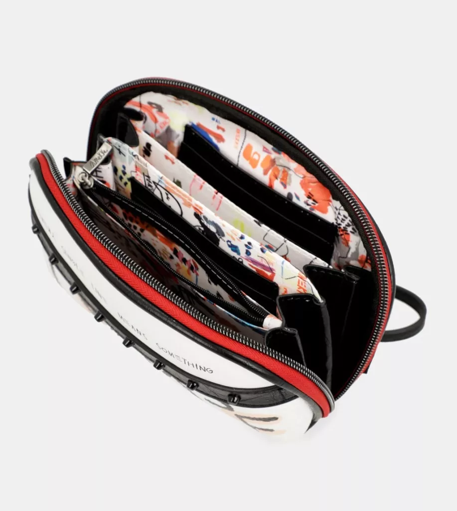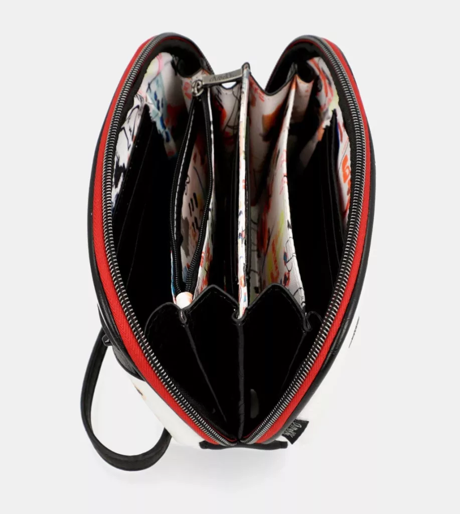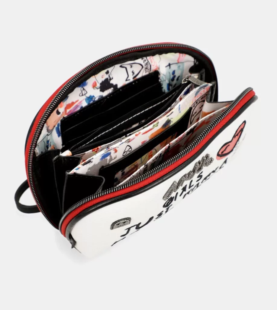 Ezt az eredeti női pénztárcát, amely kézitáskaként is használható, a 80-as évek divatja és zenéje ihlette, és a színterápia ihlette, amely átadja az üres vásznak erejét: a lehetőségek világát, hogy azt festhesd, amit csak szeretnél.