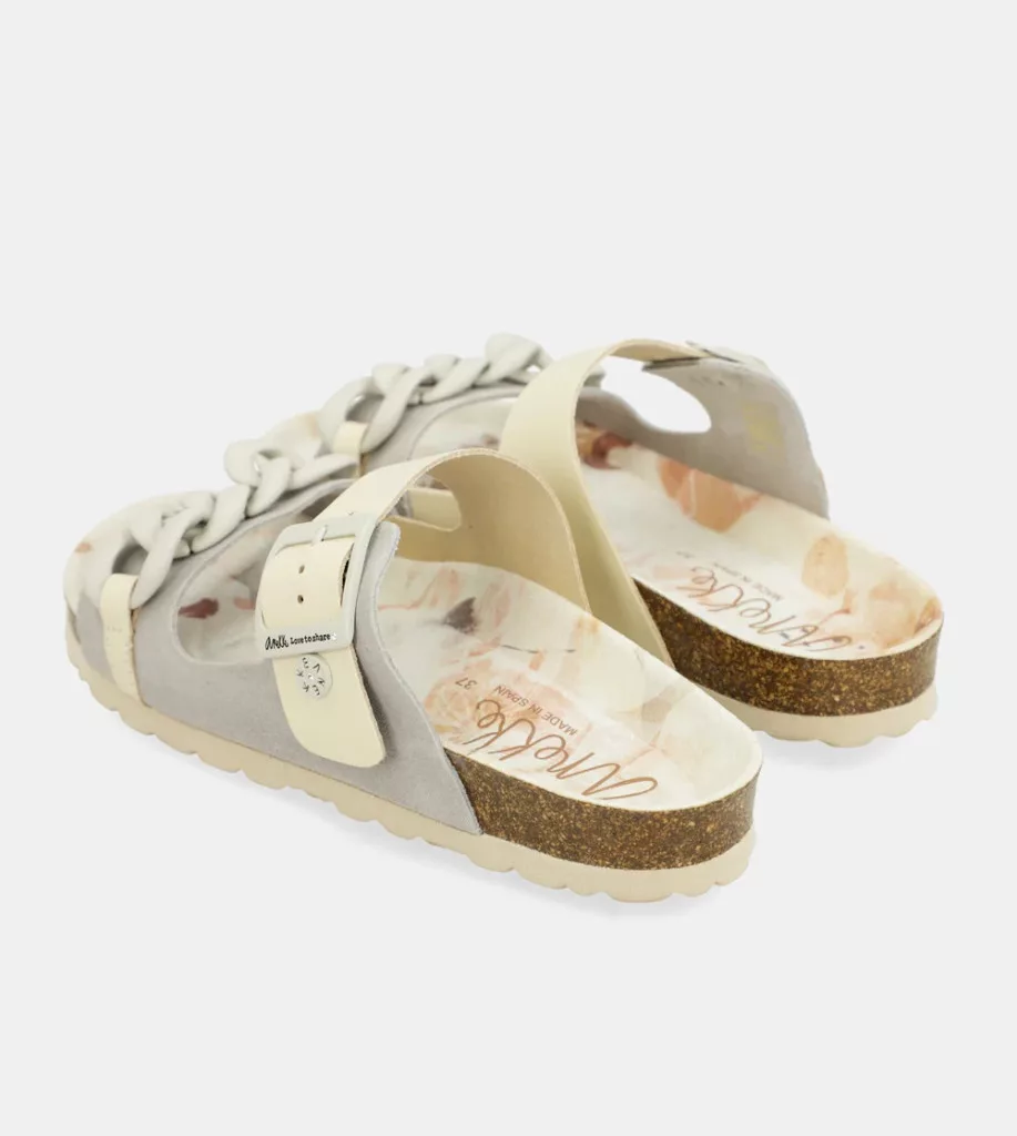 Természetes parafa alappal, rózsaszín tónusú anyaggal kombinálva, valamint eredeti nyomott talppal. A testreszabott csat könnyen állítható a különböző méretekhez.